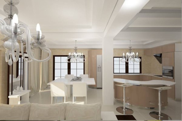 Cu cât camera este mai mare, cu atât mai puțin vizibile vor fi pereții neuniformi și colțurile oblice. Este bine dacă există posibilitatea de a combina bucătăria cu o altă cameră. În acest caz, veți obține o cameră spațioasă. Poate servi ca bucătărie-sufragerie. Zonarea unei camere se face de obicei cu un bar sau alt mobilier. Puteți separa vizual zona de gătit de masa de mese făcând podeaua sau tavanul la diferite niveluri. Firma Design Interior Arad
