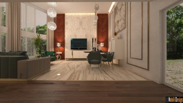 În timpul dezvoltării proiectului, proiectanții au fost inspirați de ideea de „integritate spațială”: structurile de pe tavan erau inițial un element solid, iar apoi această structură a fost „deschisă”, iar pe tavan au apărut elemente separate. Podiumul înalt de 150 mm proiectat de designeri are o funcție practică – furnizarea de comunicații. Culorile interioare se bazează pe o combinație strălucitoare de trei culori. Amenajari interioare Living realizate de Nobili Interior Design